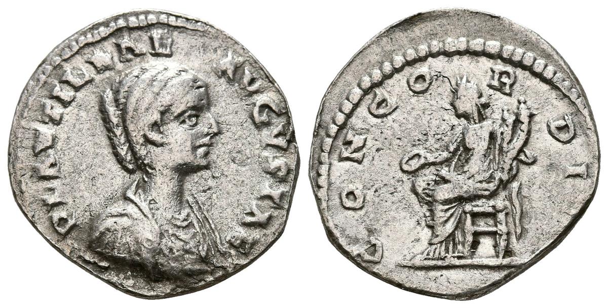 PLAUTILLA. Denarius. (Ar. 2.96g/19mm). 202 AD Laodicea. (RIC 370). Obv: Diademed and draped bust of Plautilla right, around legend: PLAVTILLAE AVGVSTAE. Rev: Concordia seated left carrying patera and cornucopia, around legend: CONCORDIAE. Good Very Fine.