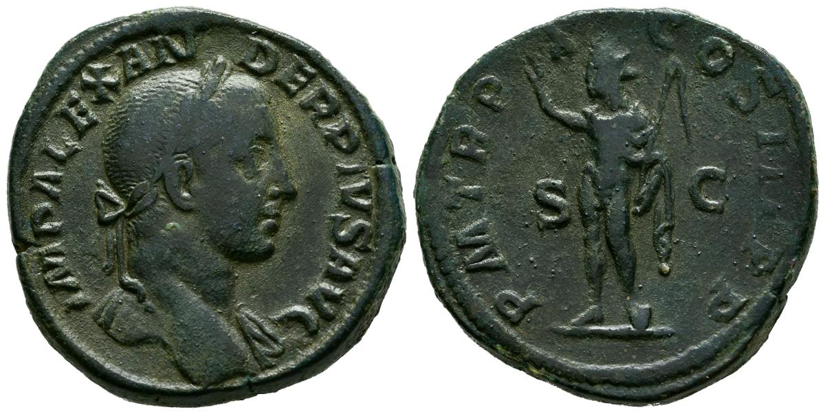 SEVERUS ALEXANDER. Sesterce. (Ae. 28.97g/31mm). 231 AD Rome. (RIC 511). Obv: Laureate bust of Alexander Severus right with draping over left shoulder, around legend: IMP ALEXANDER PIVS AVG. Rev: Sun standing left holding whip and raising right hand, between Uncirculated, around legend: PM TR PX COS III P P. Very Fine. Green patina.