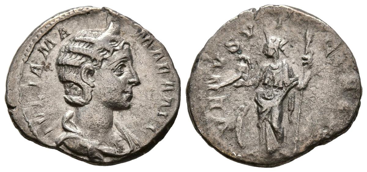 JULIA MAMAEA. Denarius. (Ar. 2.65g/19mm). 222-235 AD Rome. (RIC 358). Obv: diademed and draped bust of Julia Mamaea right, around legend: IVLIA MAMAEA AVG. Rev: Venus standing right holding helmet and scepter, at her feet shield, around legend: VENVS VICTRIX. Very Fine.