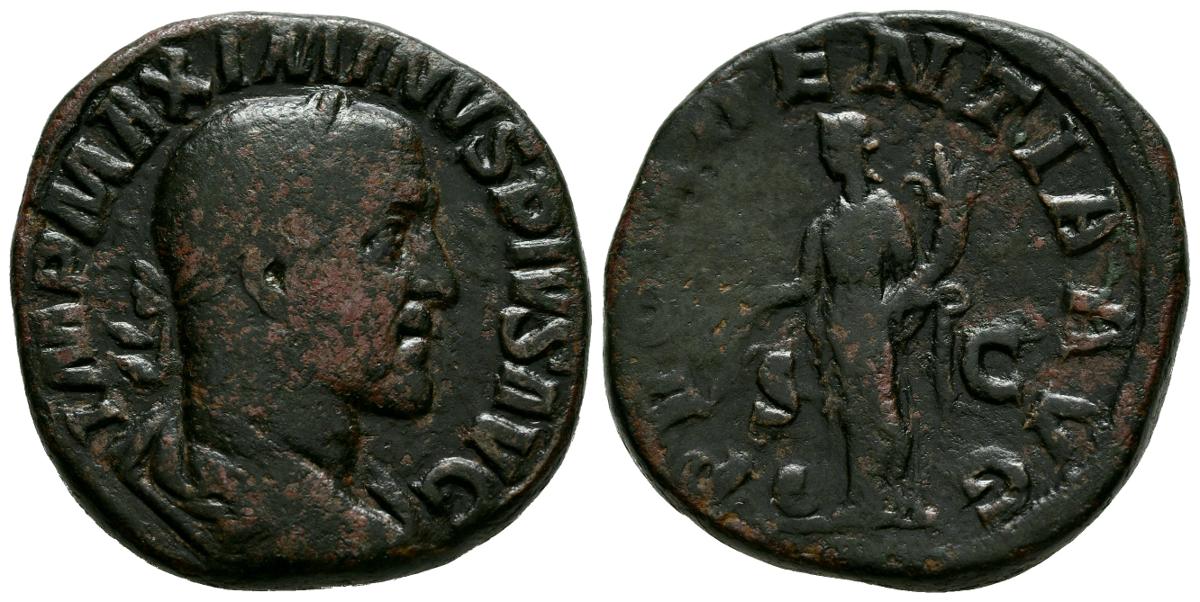 MAXIMINUS I. Sestertius. (Ae. 20.06g/30mm). 235-236 AD Rome. (RIC 61). Obv: Laureate and draped bust of Maximin I right, around legend: IMP MAXIMINVS PIVS AVG. Rev: Providentia standing left holding cornucopia and rod on globe, between: Uncirculated, around legend: PROVIDENTIA AVG. Very Fine.