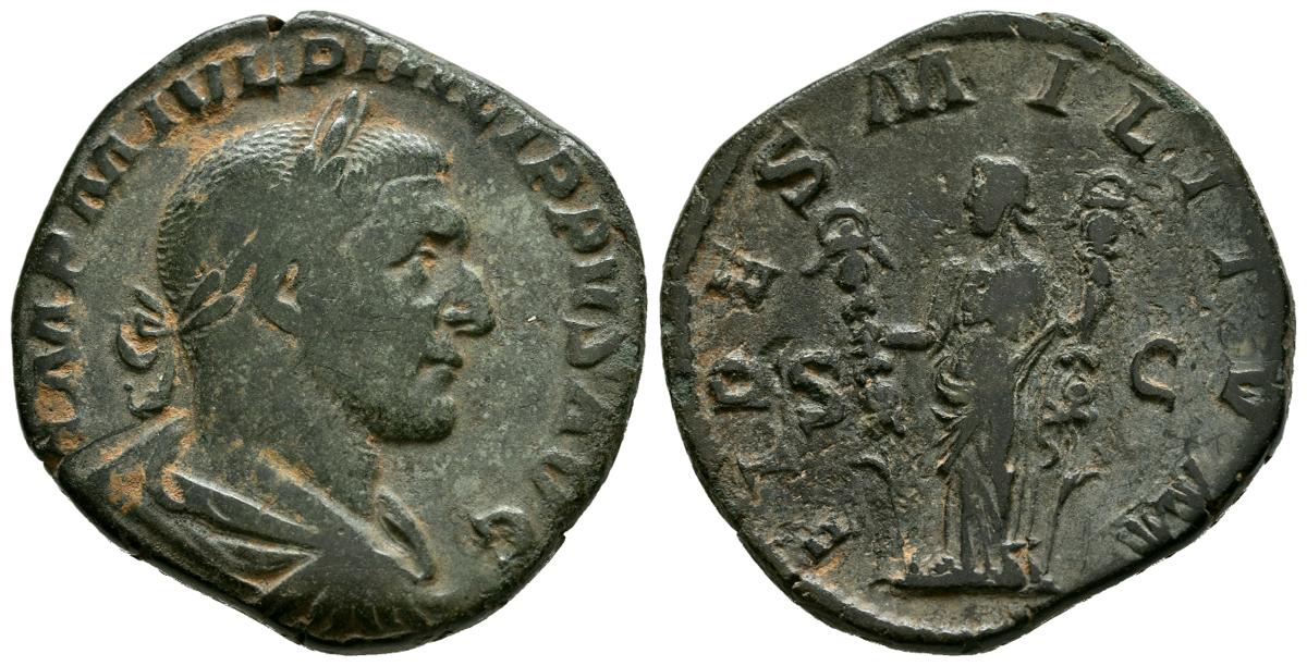 PHILIP I. Sestertius. (Ae. 14.72g/29mm). 244-249 AD Rome. (RIC 172a). Obv: Laureate and draped bust of Philip I right, around legend: IMP M IVL PHILIPPVS AVG. Rev: Fides standing left carrying two banners, between Uncirculated, around legend: FIDES MILITVM. Almost Very Fine.