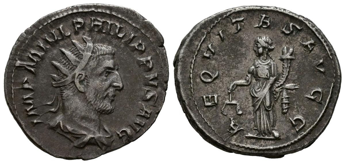 PHILIP I. Antoninianus. (Ar. 3.82g/22mm). 245-247 AD Rome. (RIC 27b). Obv: Radiated and draped bust of Philip I right, around legend: IMP M IVL PHILIPPVS AVG. Rev: standing left holding scales and cornucopia, around legend: AEQVITAS AVGG. Good Very Fine.