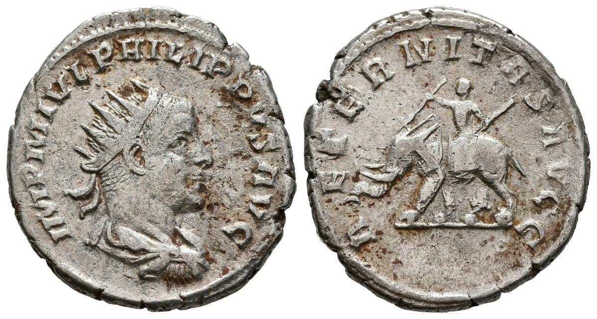 PHILIP I. Antoninianus. (Ar. 4.43g/22mm). 247-249 AD Rome. (RIC 58). Obv: Radiated and draped bust of Philip I right, around legend: IMP M IVL PHILIPPVS AVG. Rev: Elephant led by guide above, around legend: AETERNITAS AVGG. Very Fine.