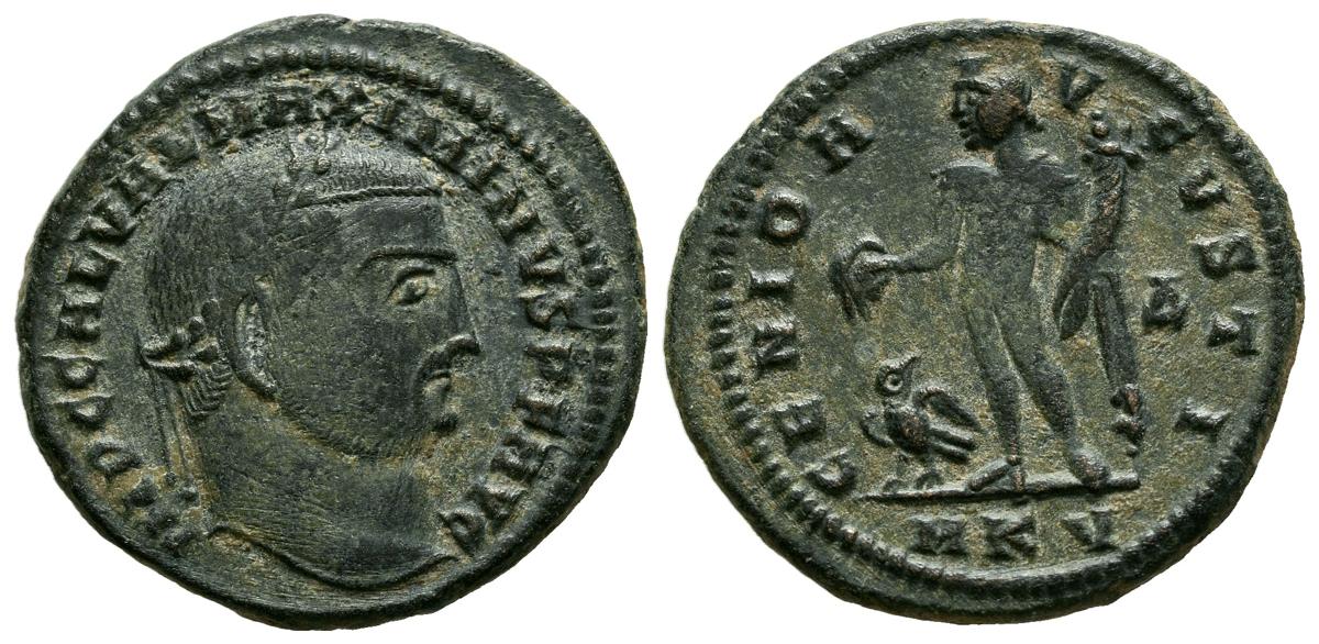MAXIMINUS II. Follis. (Ae. 5.03g/22mm). 311-312 AD Cyzicus. (RIC 84a). Obv: Laureate bust of Maximin II right, around legend: IMP C GAL VAL MAXIMINVS PF AVG. Rev: Genius standing left carrying patera and cornucopia, at his feet eagle, in field A, in exergue: MKV, around legend: GENIO AVGVSTI. Good Very Fine.