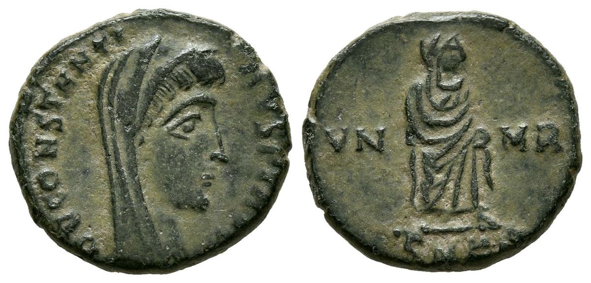 CONSTANTINE I Follis. (Ae. 2.24g/15mm). 307-337 AD Cyzicus. (RIC 46). Obv: Veiled head of Constantine I right, around legend: DV CONSTANTINVS PT AVGG. Rev: Constantine veiled standing of Constantine I right, between: VN-MR, in exergue: SMKA. Good Very Fine.