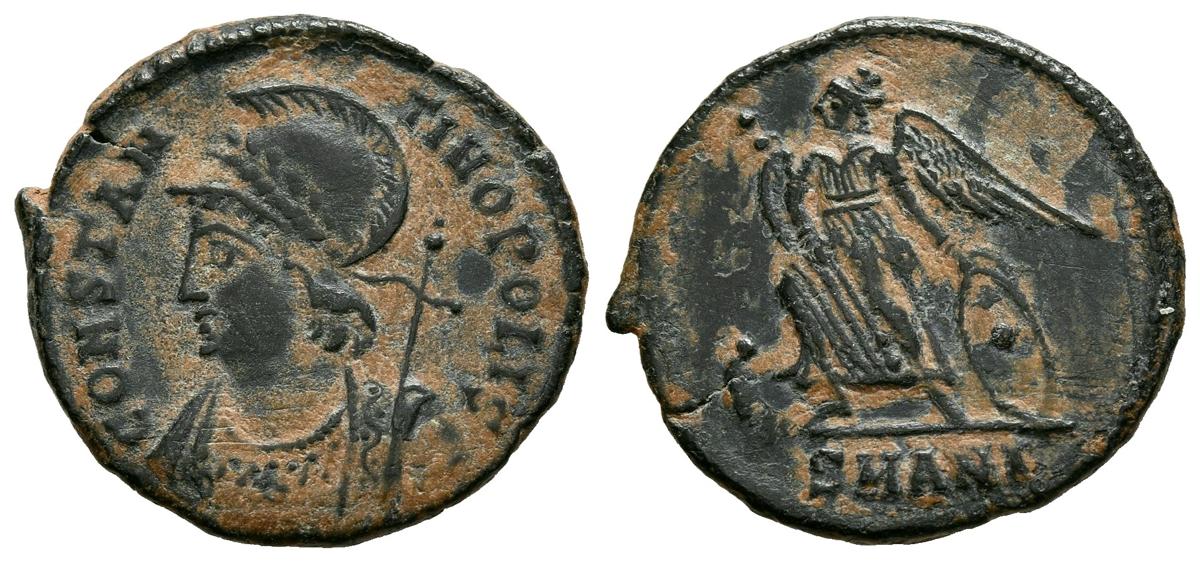 CONSTANTINE I Follis. (Ae. 2.62g/19mm). 335 AD Antioch. (RIC 92). Obv: Bust of Constantinopolis left with helmet and cuirass, with scepter on his back, around legend: CONSTANTINOPOLIS. Rev: Victory with scepter and shield on prow to left, in exergue: SMANI. Good Very Fine.