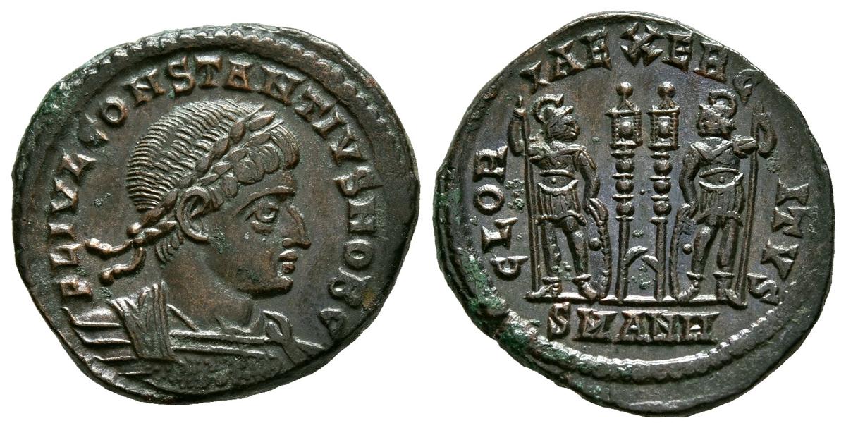 CONSTANTIUS II. Follis. (Ae. 2.59g/18mm). 335 AD Antioch. (RIC 88). Obv: Laureate and cuirassed bust of Constantius II right, around legend: FL IVL CONSTANTIVS NOB C. Rev: Two standing soldiers facing each other carrying spears, between them two banners, in exergue: SMANH, around legend: GLORIA EXERCITVS. Extremely Fine. Nice specimen.