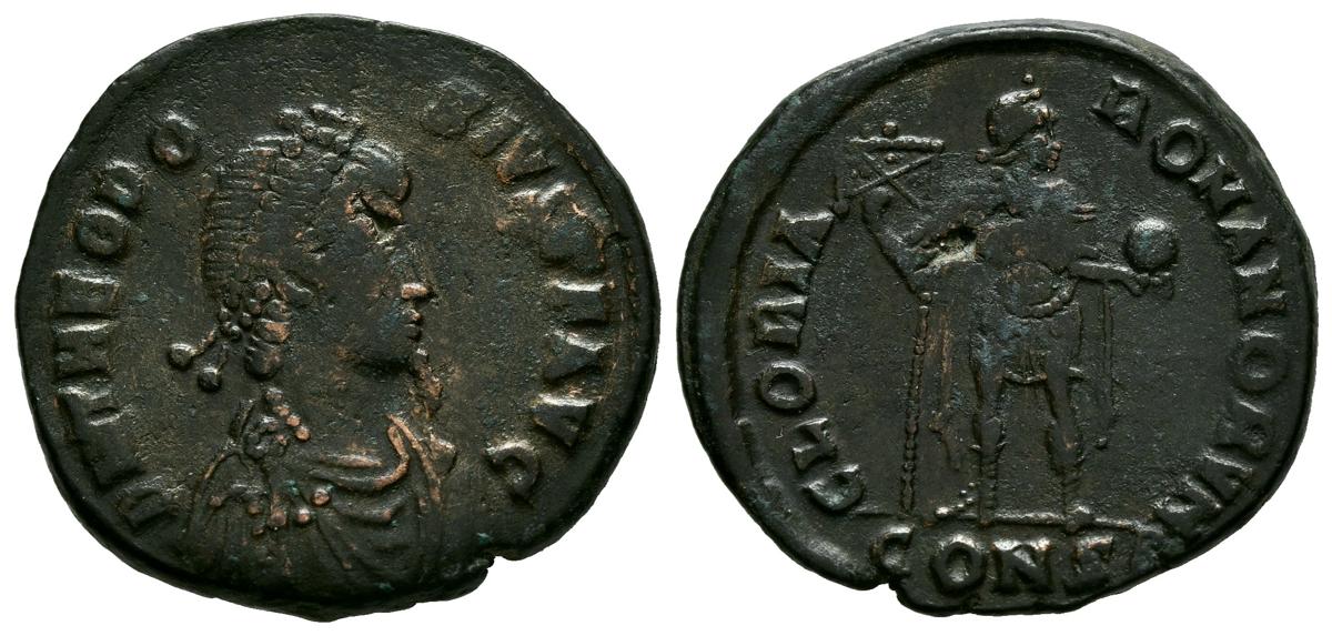 THEODOSIUS I. Follis. (Ae. 4.16g/22mm). 392-395 AD Constantinople. (RIC 88a). Obv: Diademed, draped and cuirassed bust of Theodosius I right, around legend: DN THEODOSIVS PF AVG. Rev: Teodosio I standing right holding globe and banner, in exergue: CONS, around legend: GLORIA ROMANORVM. Very Fine.