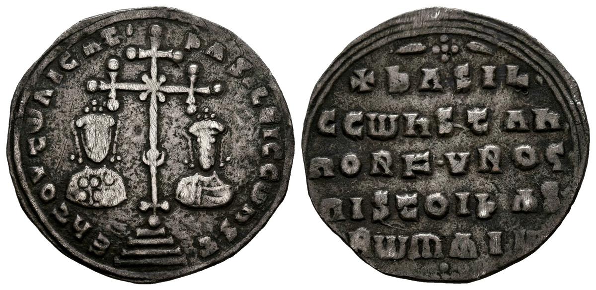 BASIL II and CONSTANTINE VIII. Miliaresion. (Ar. 2.08g/22mm). 977-989 AD Constantinople. (Seaby 1810). Obv: Two crowned and draped busts of Basil II and Constantine VIII facing each other, including a cross, around legend. Rev: Legend in five lines. Very Fine.