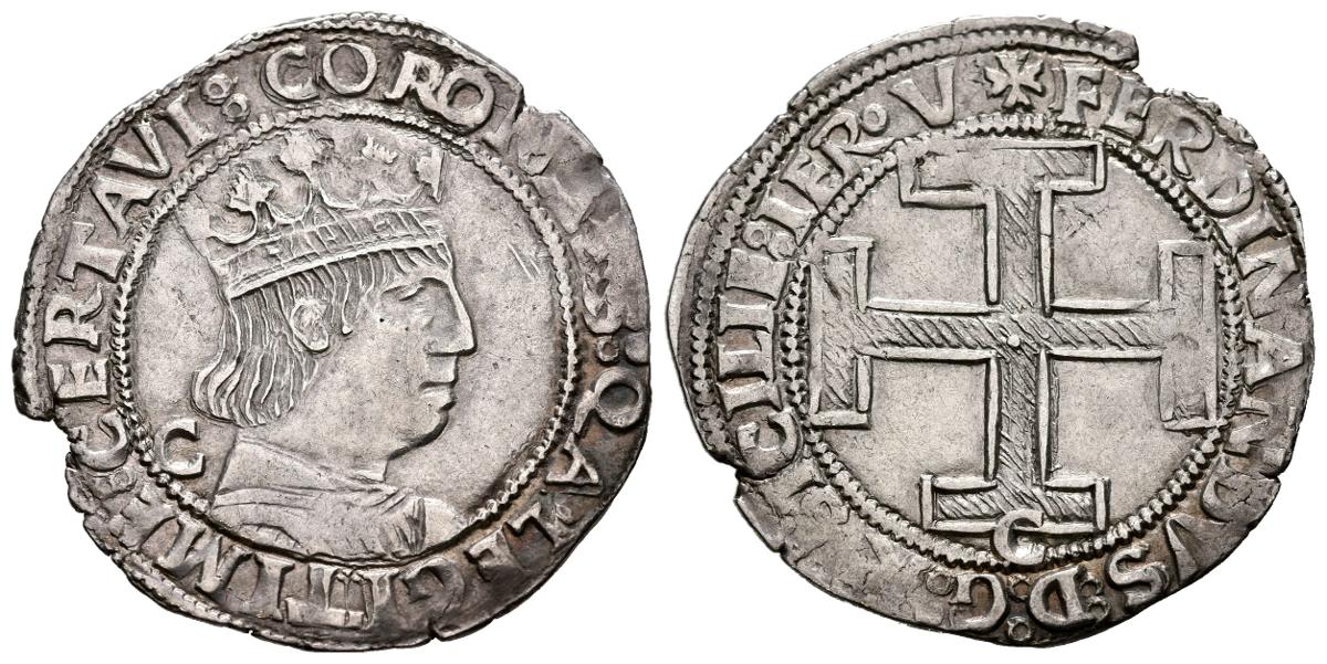English FERDINAND I OF NAPLES (1458-1494). 1 Goring (Ar. 3.92g/27mm). Naples. (Cru VS 1009). Obv: Bust of Ferdinand I crowned left, letter C behind, legend around: CORONATVS Q LEGITIME CERTAV. Rev: Cross potentiated, below letter C, around legend: FERDINANDVS DGR SI IER UNG. Almost Extremely Fine/ Good Very Fine. Nice specimen, rare like this.