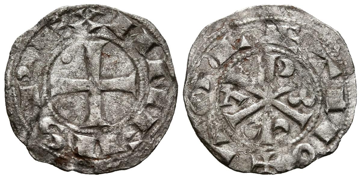 ALFONSO VI (1073-1109). Money. (see 1.20g/19mm). Toledo. (FAB-5.5). Obv: Cross kick with roel in first quadrant, around legend: ANFVS REX. Rev: Crismón between alpha and omega, around legend: TOLETVO. Very Fine.