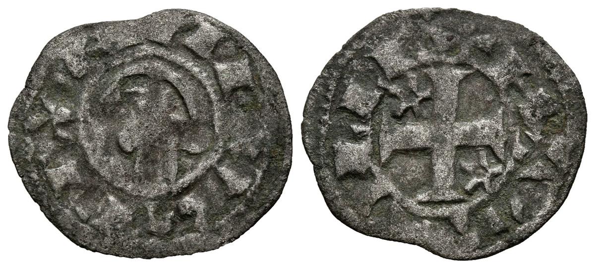 ALFONSO I OF ARAGON (1109-1126). Money (See 0.71g/18mm). Toledo (FAB-23). Obv: Head left, around legend: ANFVS REX. Rev: Cross kick with stars in the first and cuarto quadrants, legend around: TOLLETA. Almost Very Fine.