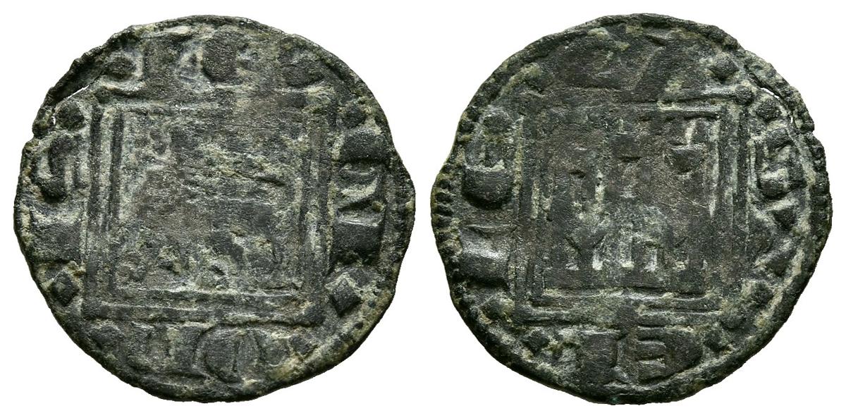 ALFONSO X (1252-1284). Obolo (Ve. 0.51g/14mm). Coruna. (FAB-282.1). standing : Lion standing left inside squared groove, around legend: CASTELLE. Rev: Castle, below scallop, all within a square groove, around legend: LEGIONIS. Very Fine.