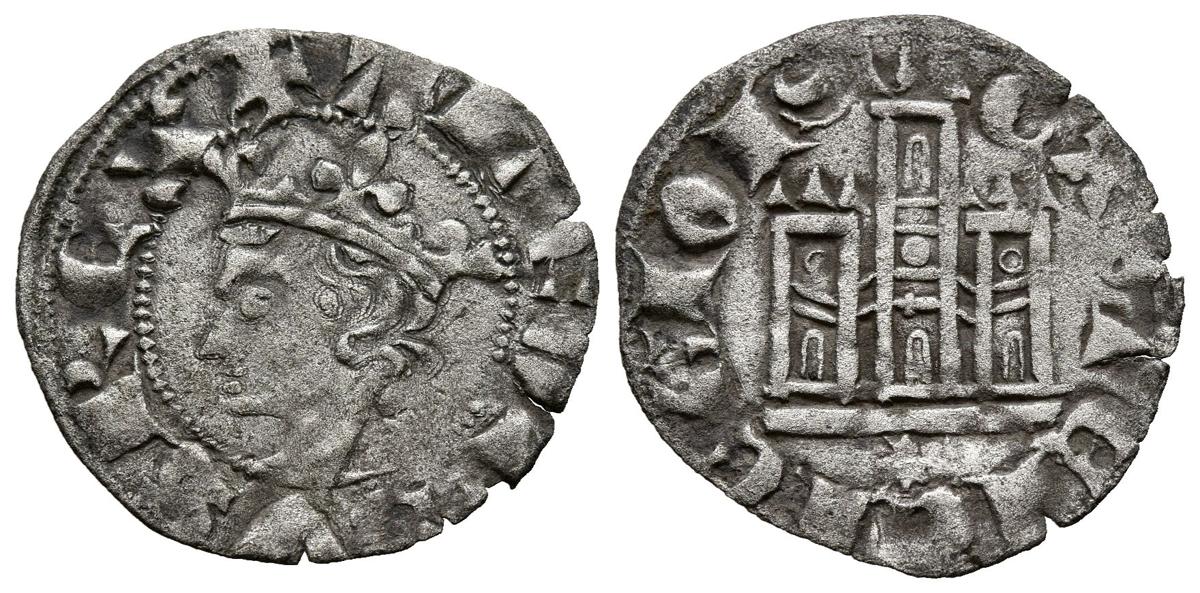 ALFONSO XI (1312-1350). horned. (see 0.57g/19mm). Coruna. (FAB-343). Obv: Crowned bust of Alfonso XI to the left within a dotted pattern, around legend: ALFONSVS REX. Rev: Castle, below it scallops, all within dotted lines, around legend: CASTELLE ET LEGIONIS. Very Fine.