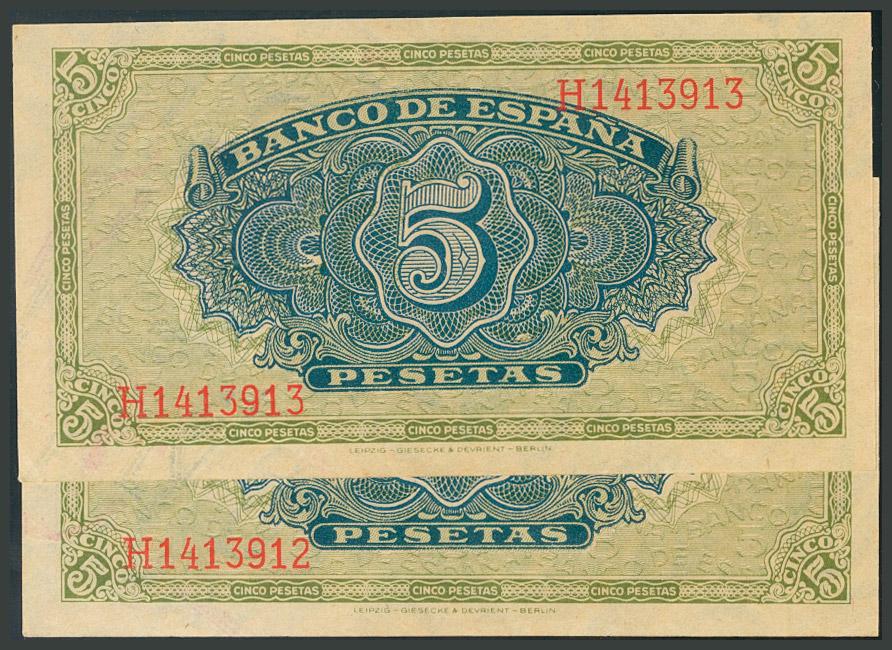 5 Pesetas. 4 de Septiembre de 1940. Pareja correlativa. Serie H. (Edifil 2017: 443a). Apresto original. SC-.