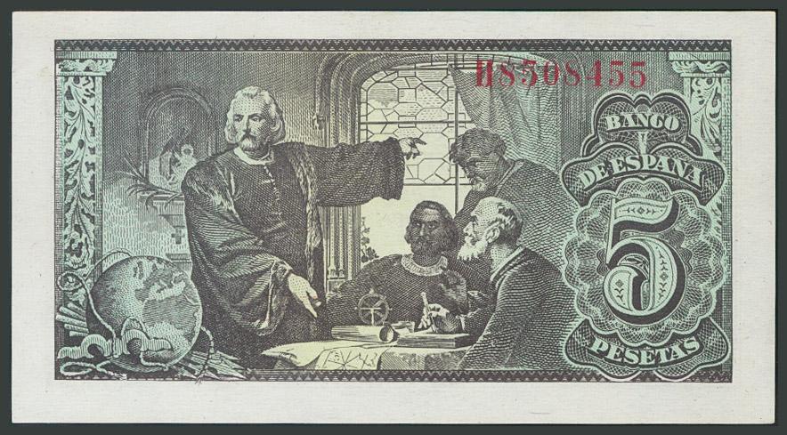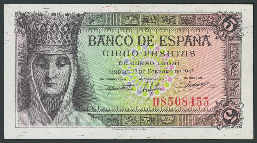 5 Pesetas. 13 de Febrero de 1943. Serie H. (Edifil 2017: 446a). SC.