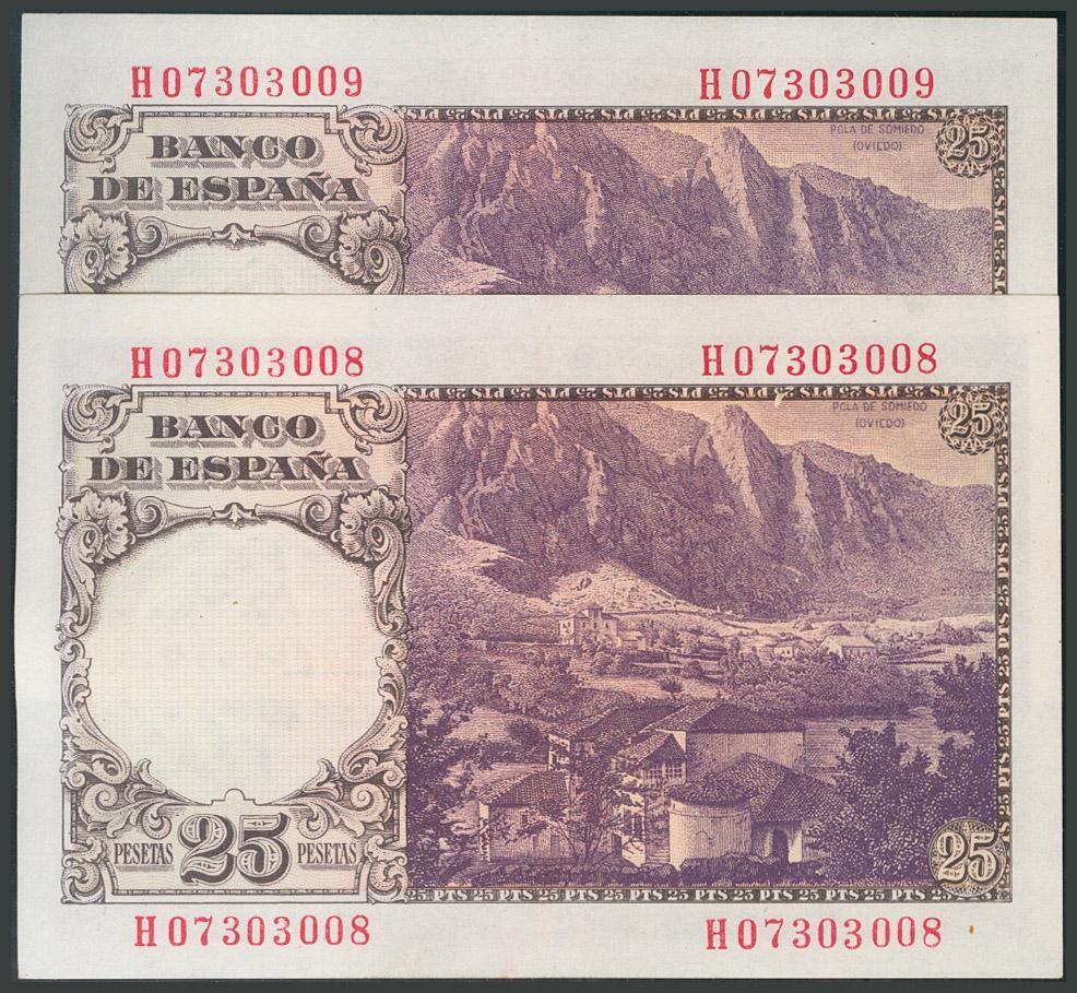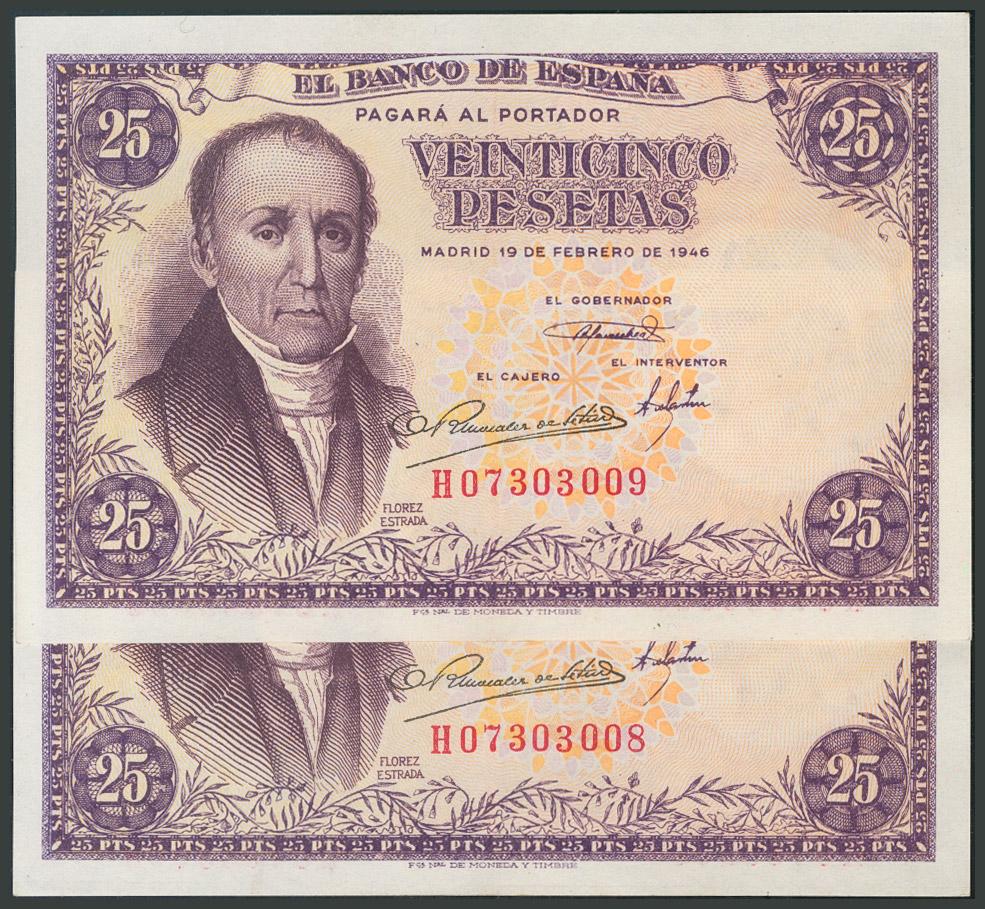 25 Pesetas. 19 de Febrero de 1946. Pareja correlativa. Serie H. (Edifil 2017: 450a). Apresto original. EBC+.