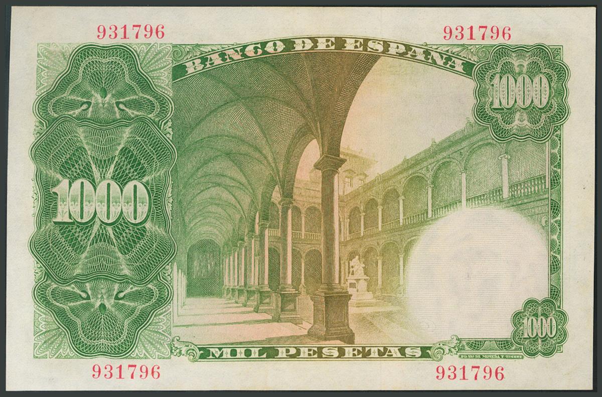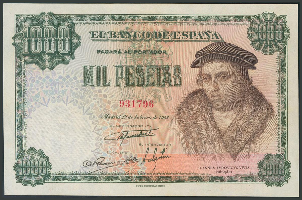 1000 Pesetas. 19 de Febrero de 1946. Sin serie. Verdaderamente invisible doblez vertical. (Edifil 2017: 453). Apresto. Raro así. EBC+.