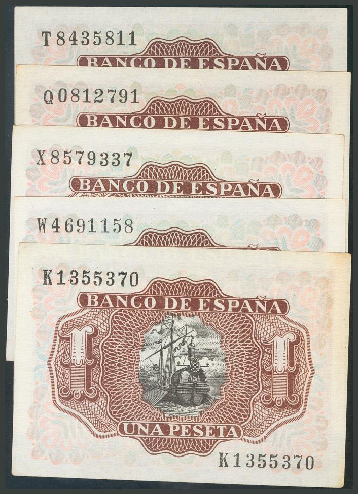 Conjunto de 5 billetes del 1 Peseta de la emisión de 22 de Julio de 1953. Series Diversas. (Edifil 2017: 465a). EBC+/MBC+.