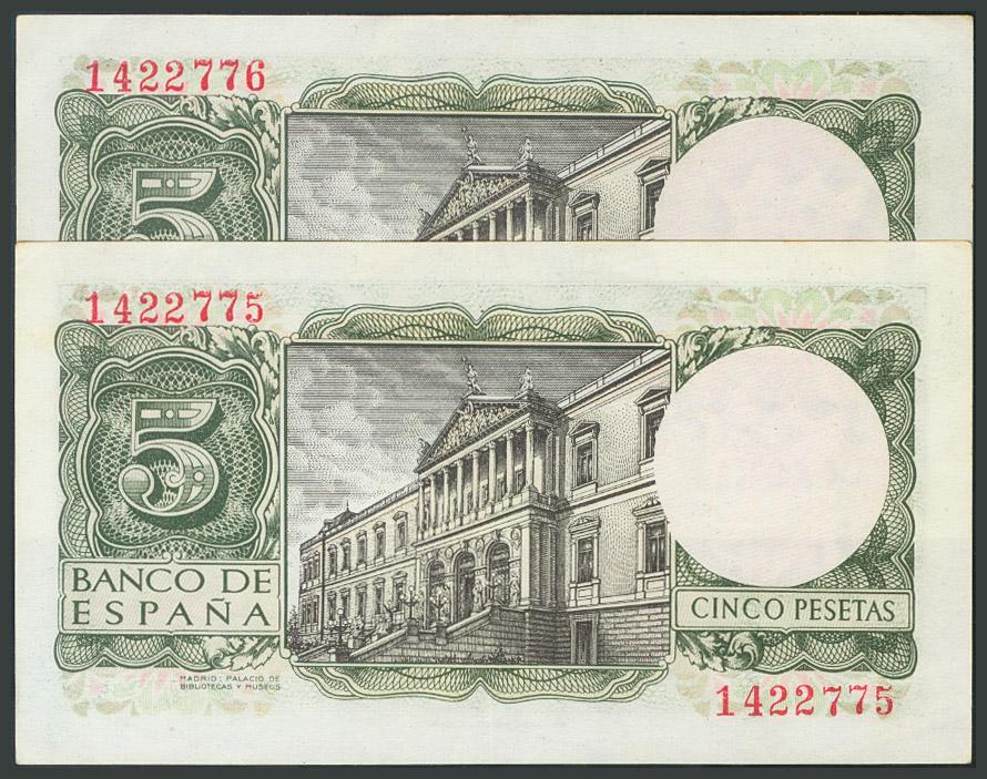 5 Pesetas. 22 de Julio de 1954. Pareja correlativa. Sin serie. Doblez vertical. (Edifil 2017: 466). EBC.