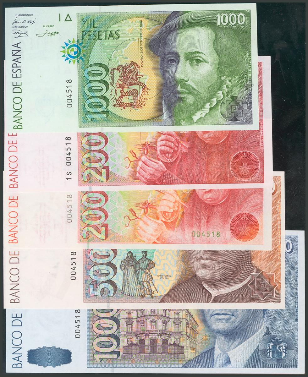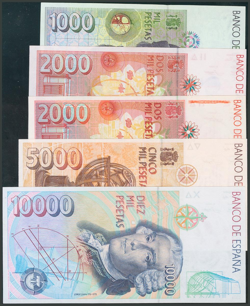 Serie de los billetes de 1000, 2000 (además otro con la numeración 1S), 5000 y 10000 Pesetas emitidos en 1992 y todos ellos con el mismo número de serie Nº004518. (Edifil 2017: 482/85, 482A). Raro conjunto. SC.