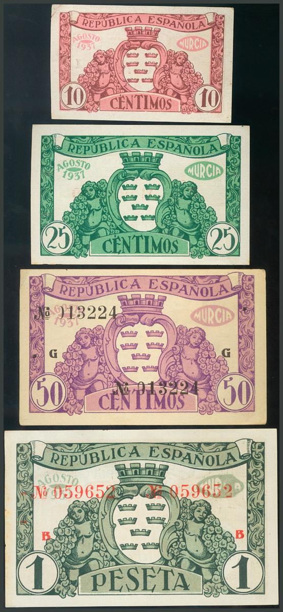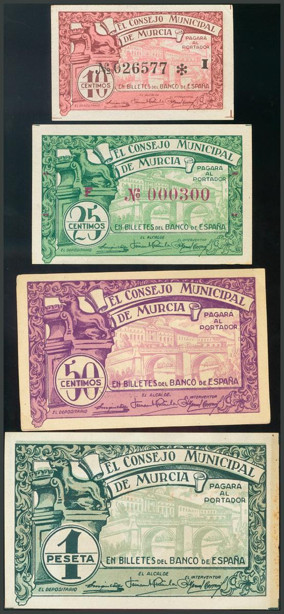 CONSEJO MUNICIPAL DE MURCIA. Serie completa 10, 25, 50 Céntimos y 1 Peseta. (Montaner: 983 C/F, Gónzalez: 3770/73). MBC+/SC-.