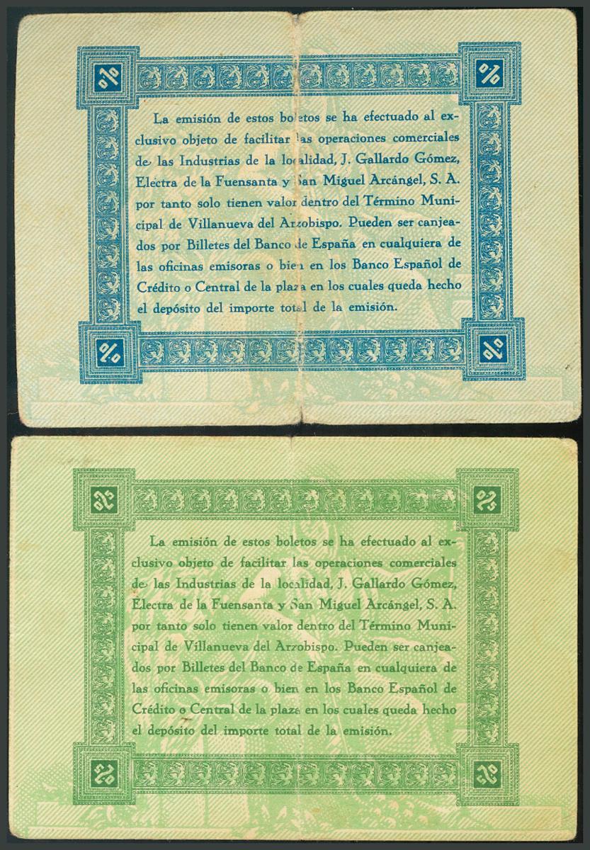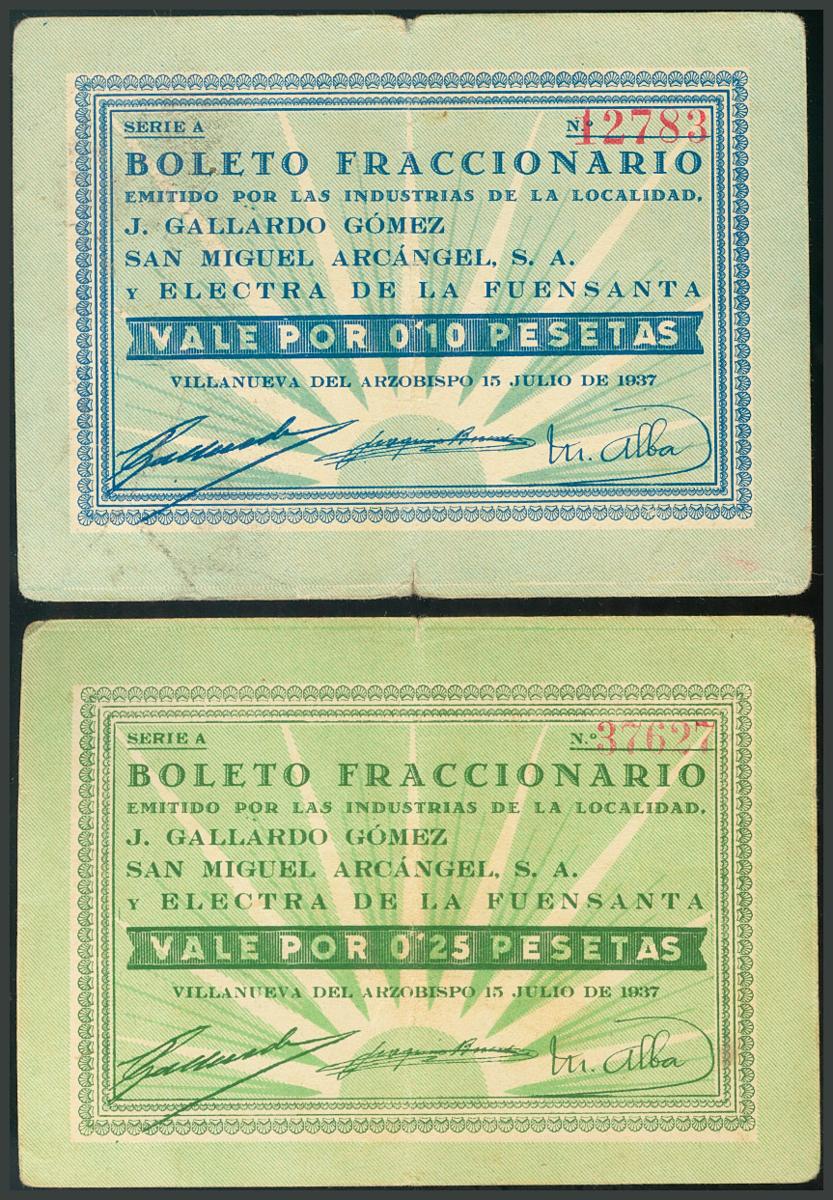 VILLANUEVA DEL ARZOBISPO (JAEN). 0´10 y 0´25 Pesetas. 1937. Para uso en las industrias de la localidad: J. Gallardo Gómez, San Miguel Arcángel S.A. y Electra de la Fuensanta. BC+. Escasos.
