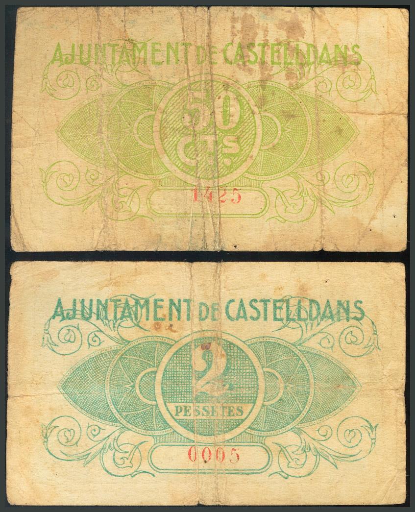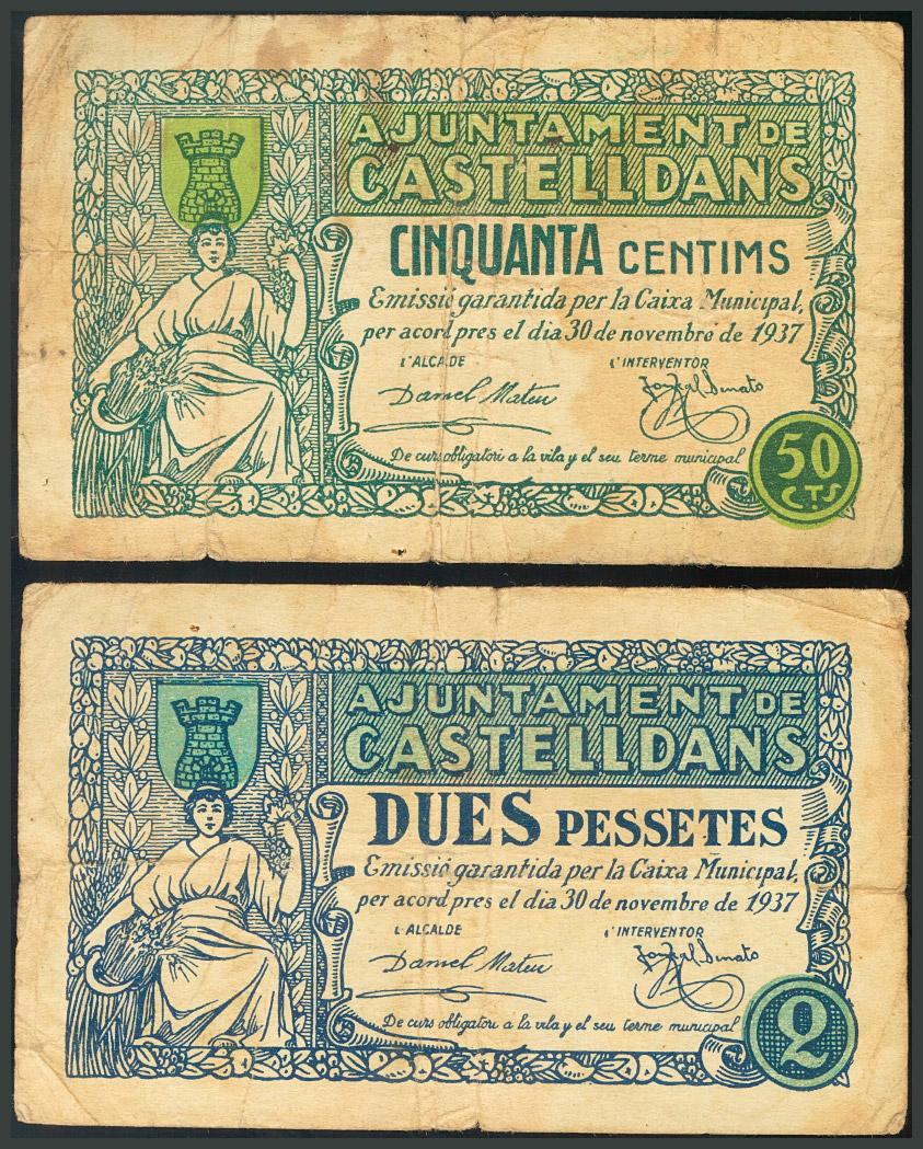 AJUNTAMENT DE CASTELLDANS (LLEIDA). 50 Céntimos y 2 Pesetas. 1937. (Montaner: 482-F/H). BC-/BC.