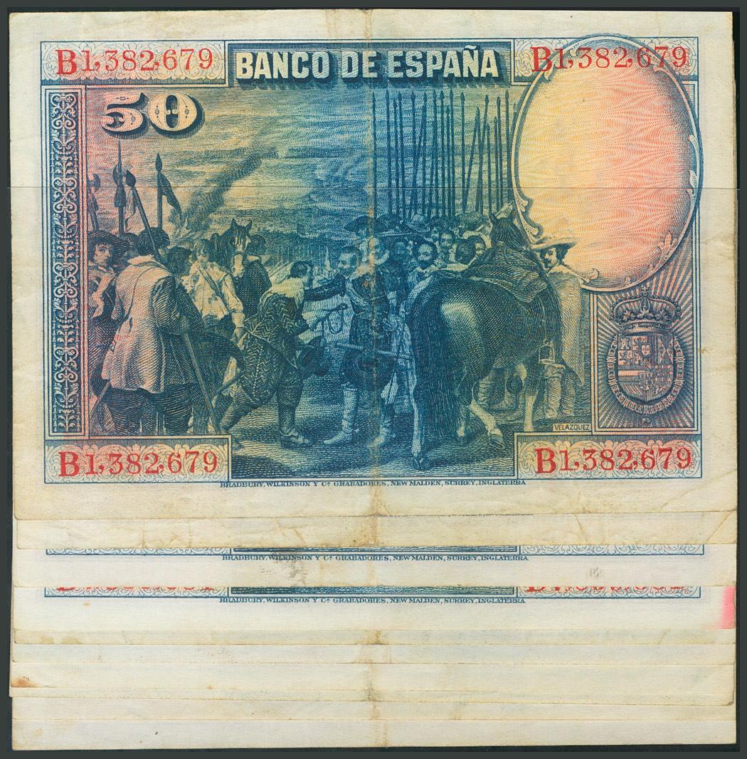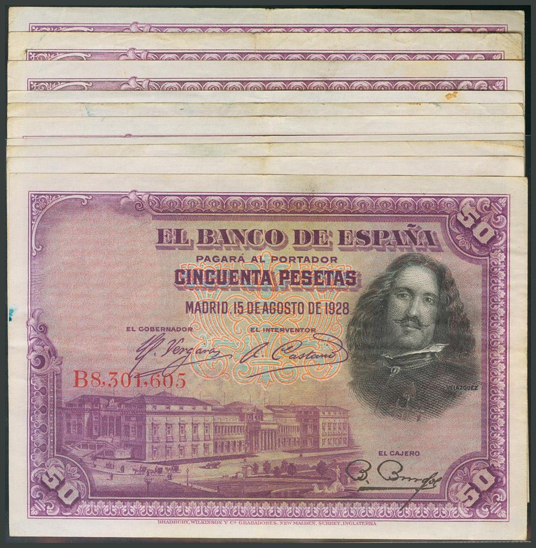 Conjunto de 10 billetes de 50 Pesetas de la emisión del 15 de Agosto de 1928. (Edifil 2017: 329a). BC.
