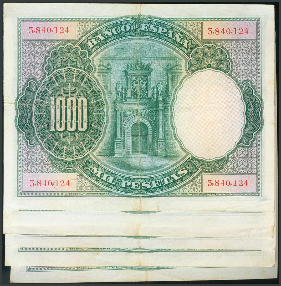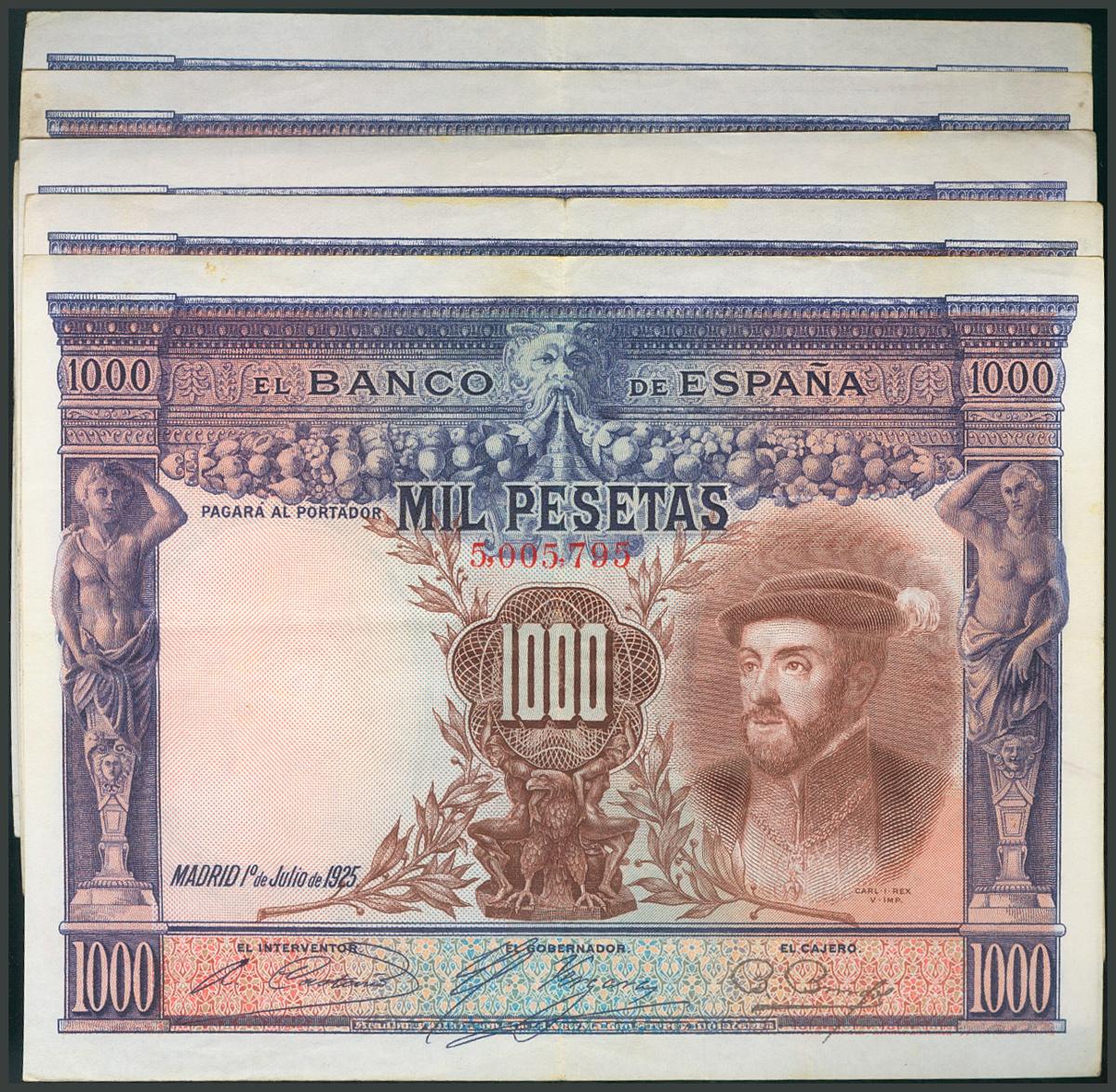 Conjunto de 5 billetes de 1000 Pesetas de la emisión del 1 de Julio de 1925. Serie posterior al 3.646.000. (Edifil 2017: 351). MBC/BC.