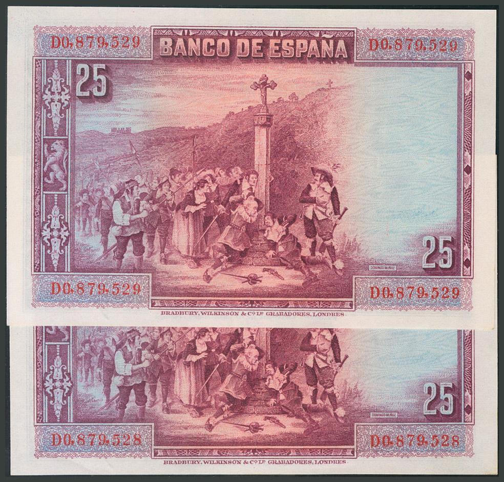 25 Pesetas. 15 de Agosto de 1928. Pareja correlativa. Serie D. Invisible ondulación. (Edifil 2017: 353). Apresto original. EBC+.
