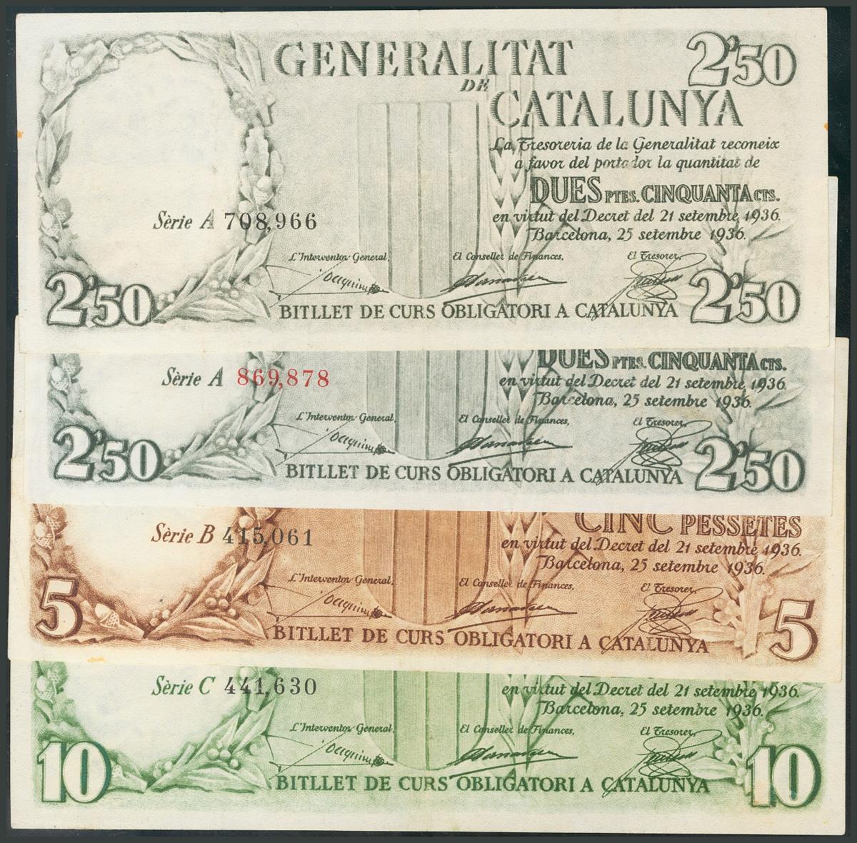 Serie completa de los tres billetes de 2´50 Pesetas (incluyendo la numeración en rojo y negro), 5 Pesetas y 10 Pesetas. 25 de Septiembre de 1936. Generalitat de Catalunya de 1936. (Edifil 372/74, 372a). MBC.