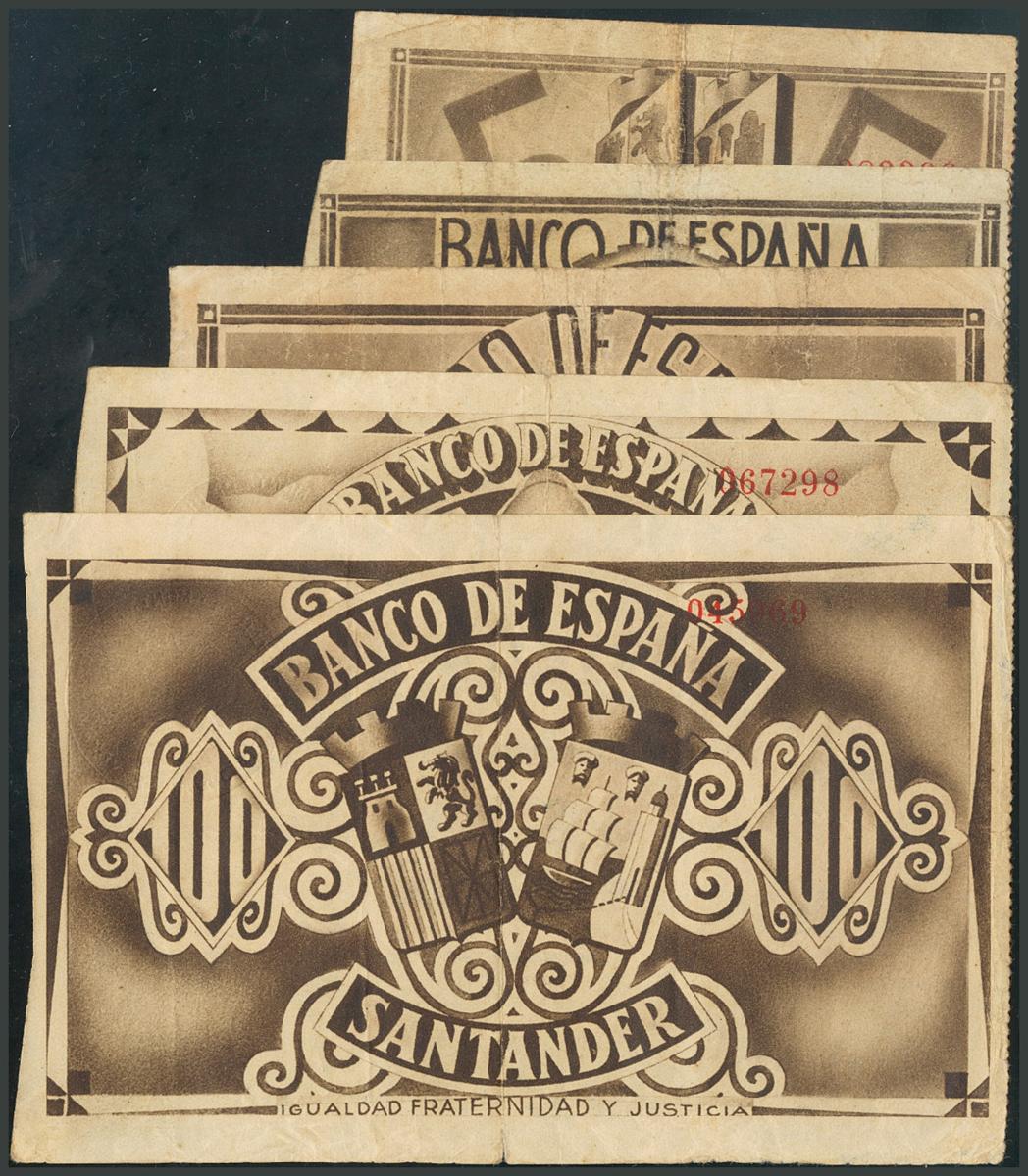 Serie de los cinco billetes de 5, 10, 25, 50 y 100 Pesetas. 1 de Noviembre de 1936. Banco de España, Santander. (Edifil 2017: 375c, 376h, 377h, 378h, 379h). BC+/MBC.