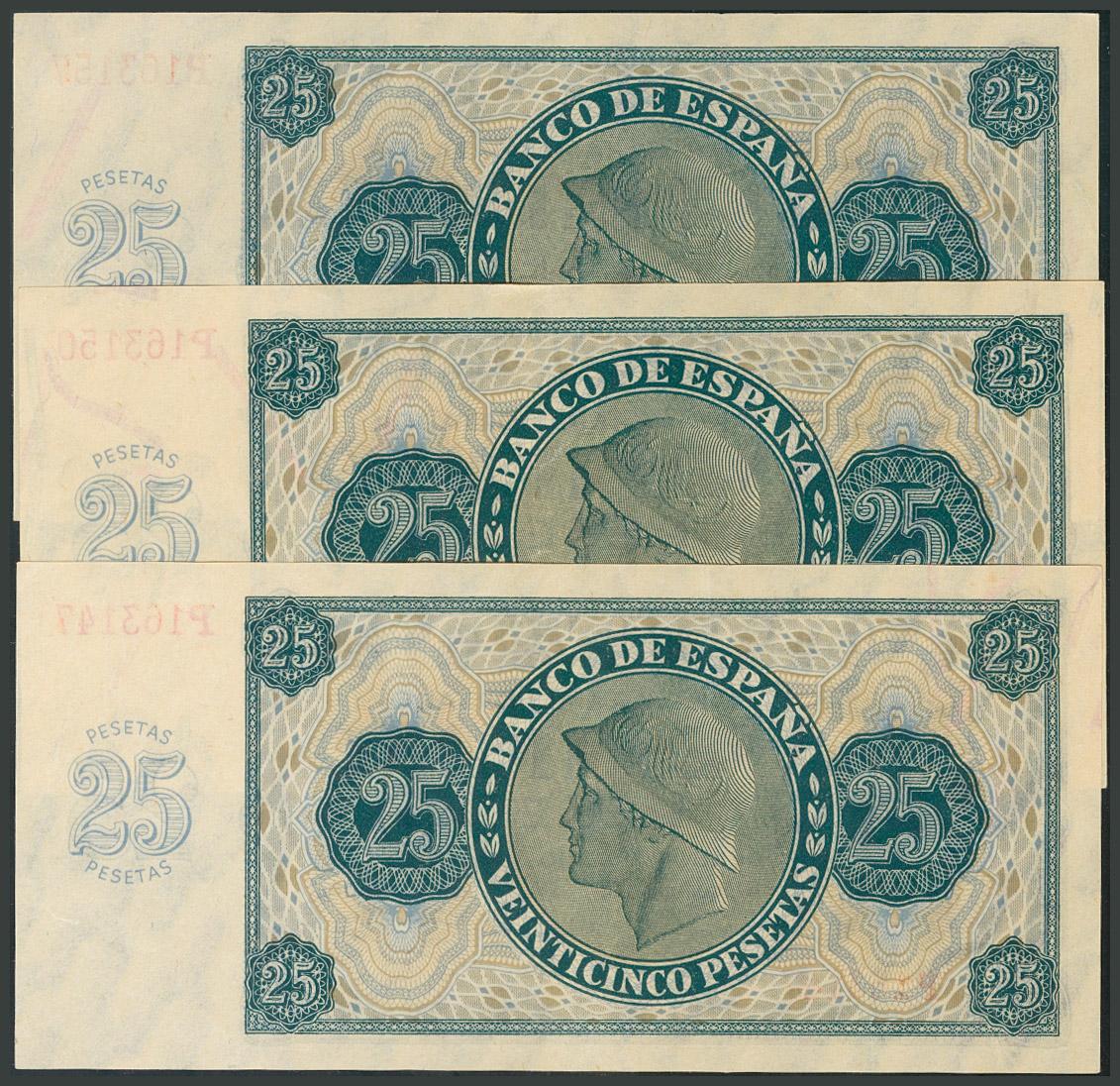 25 Pesetas. 21 de Noviembre de 1936. Banco de España, Burgos, trío casi consecutivo. Serie P. Ondulados verticalmente, fibra sin romper. Apresto original. (Edifil 2017: 419a). EBC+.