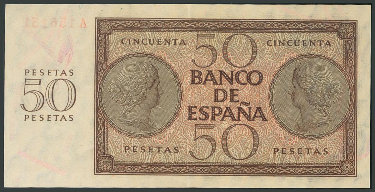 50 Pesetas. 21 de Noviembre de 1936. Serie A. Doblez vertical. (Edifil 2017: 420). Apresto original. EBC.