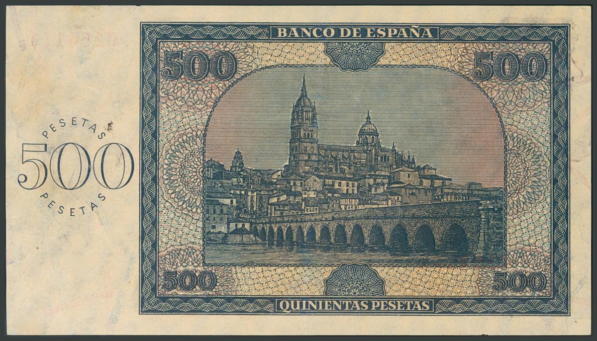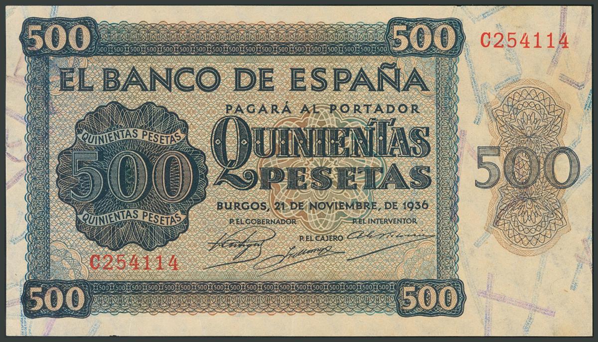 500 Pesetas. 21 de Noviembre de 1936. Serie C. Verdaderamente invisible doblez vertical. (Edifil 2017: 422a). Resto de apresto original. EBC+.
