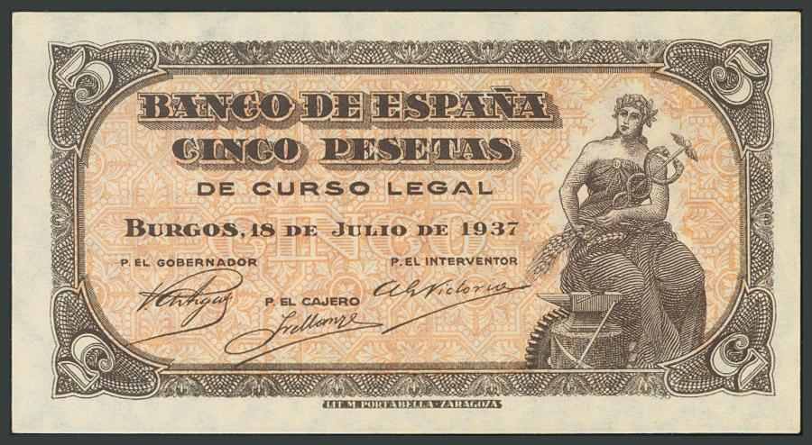 5 Pesetas. 18 de Julio de 1937. Banco de España, Burgos. Sin serie. (Edifil 2017: 424). Conserva su apresto original. SC-.