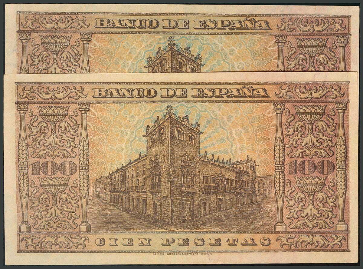 100 Pesetas. 20 de Mayo de 1938. Pareja correlativa. Serie D. (Edifil 2017: 432a). Apresto original. Inusual. EBC+.