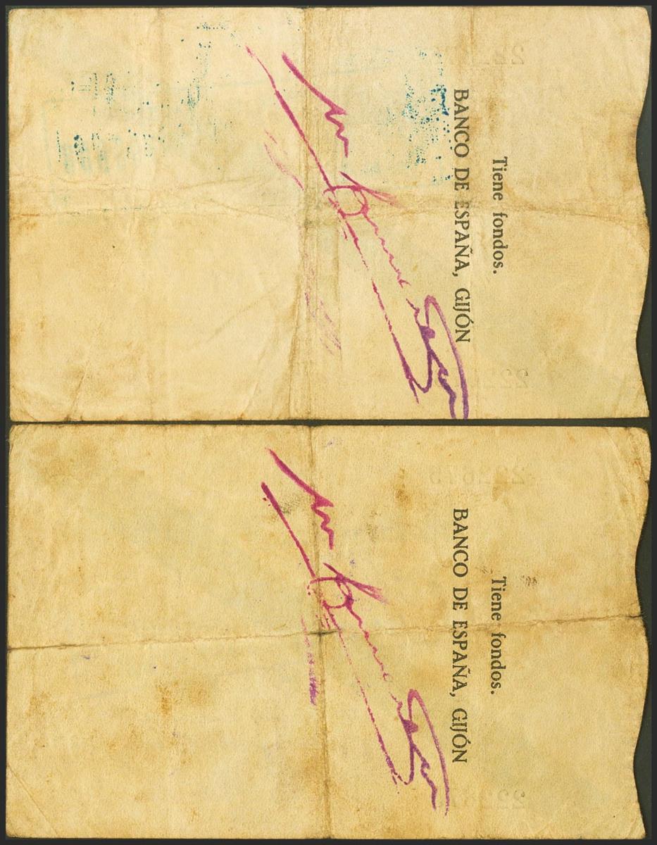 25 pesetas. November 5, 1936. Gijón branch. Correlative pair. No serie. (Edifil 2021: 382). Very rare couple. Good Very Fine.