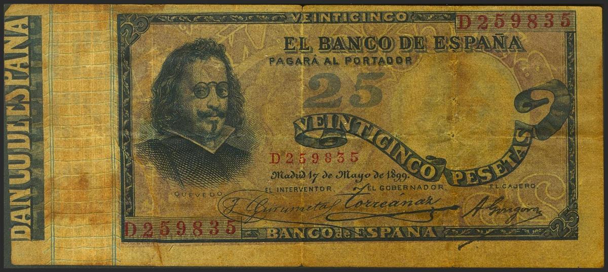 25 pesetas. May 17, 1899. Series D. (Edifil 2021: 306). Rare, heavily aged paper. Almost Fine.