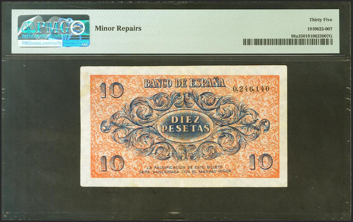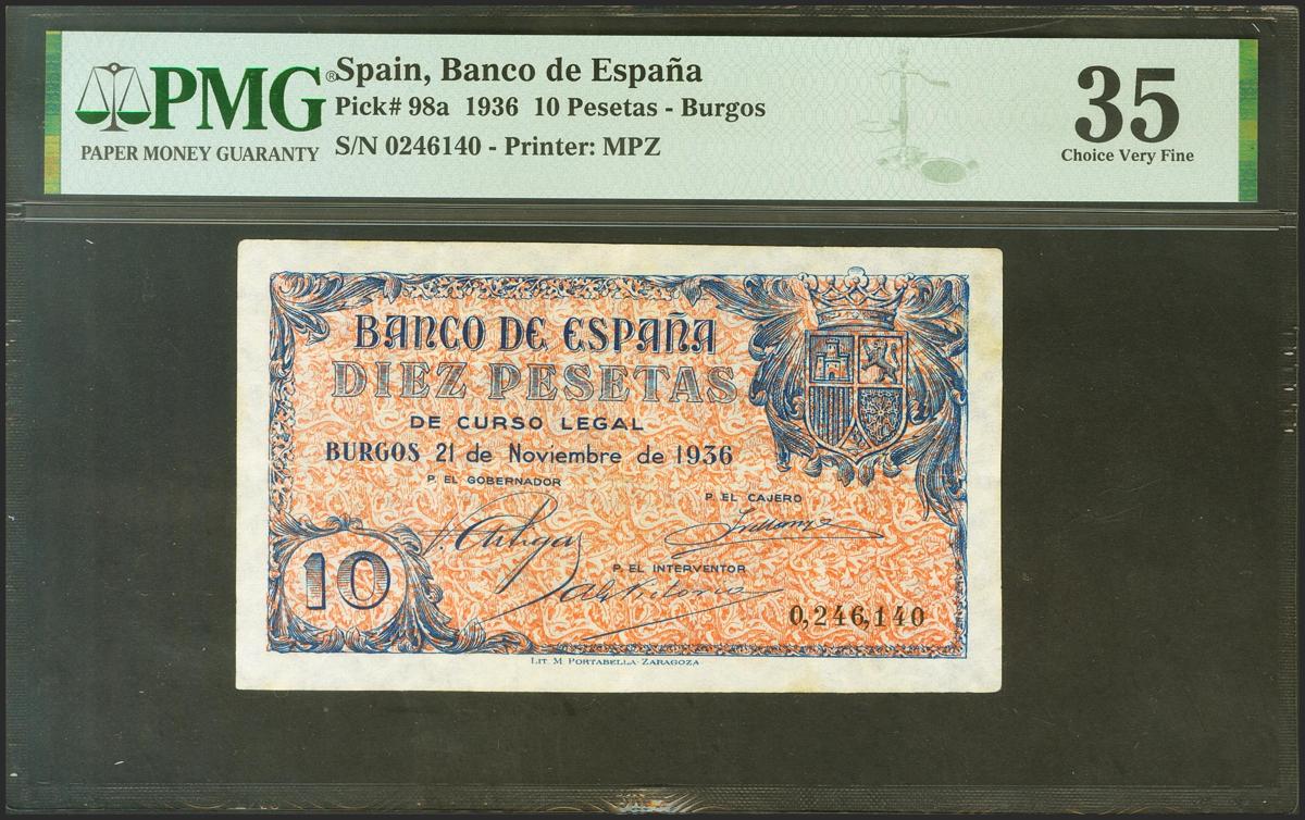 English 10 pesetas. November 21, 1936. No series. (Edifil 2017: 418, Pick: 98a). Rare, minimally repaired, beautiful appearance. Very Fine. PMG35 encapsulation.