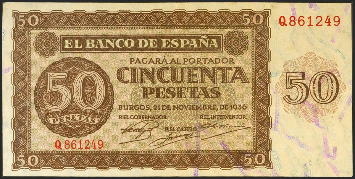 50 pesetas. November 21, 1936. Series Q. (Edifil 2021: 420a). It retains much of its original sizing. Extremely Fine.