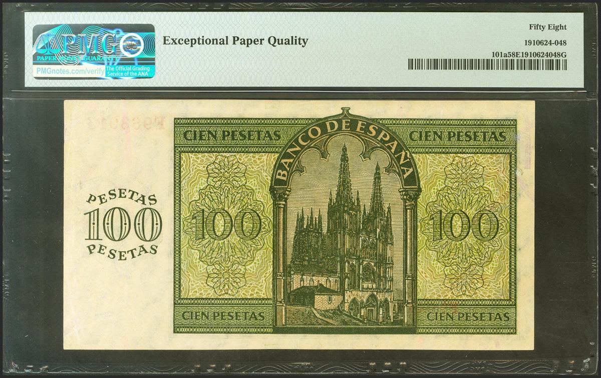 100 pesetas. November 21, 1936. Series F. (Edifil 2021: 421a, Pick: 101a). Original sizing. EBC+++. PMG58EPQ package.