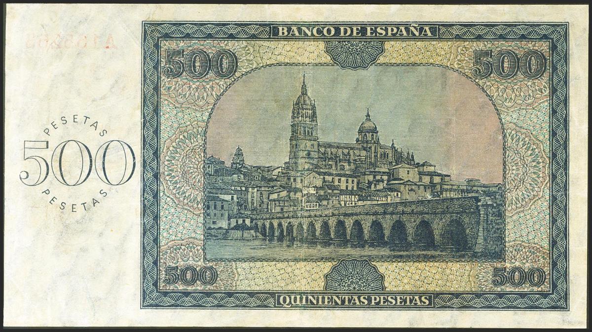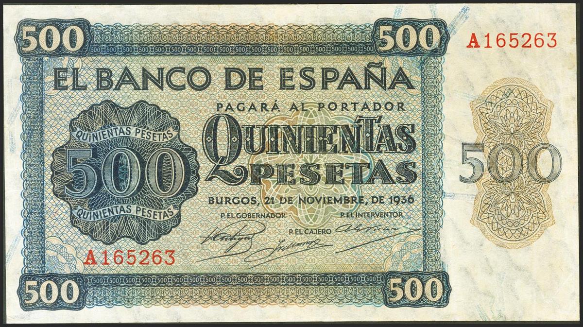 500 pesetas. November 21, 1936. Series A. (Edifil 2021: 422). Rare, minimally repaired. Very Fine.