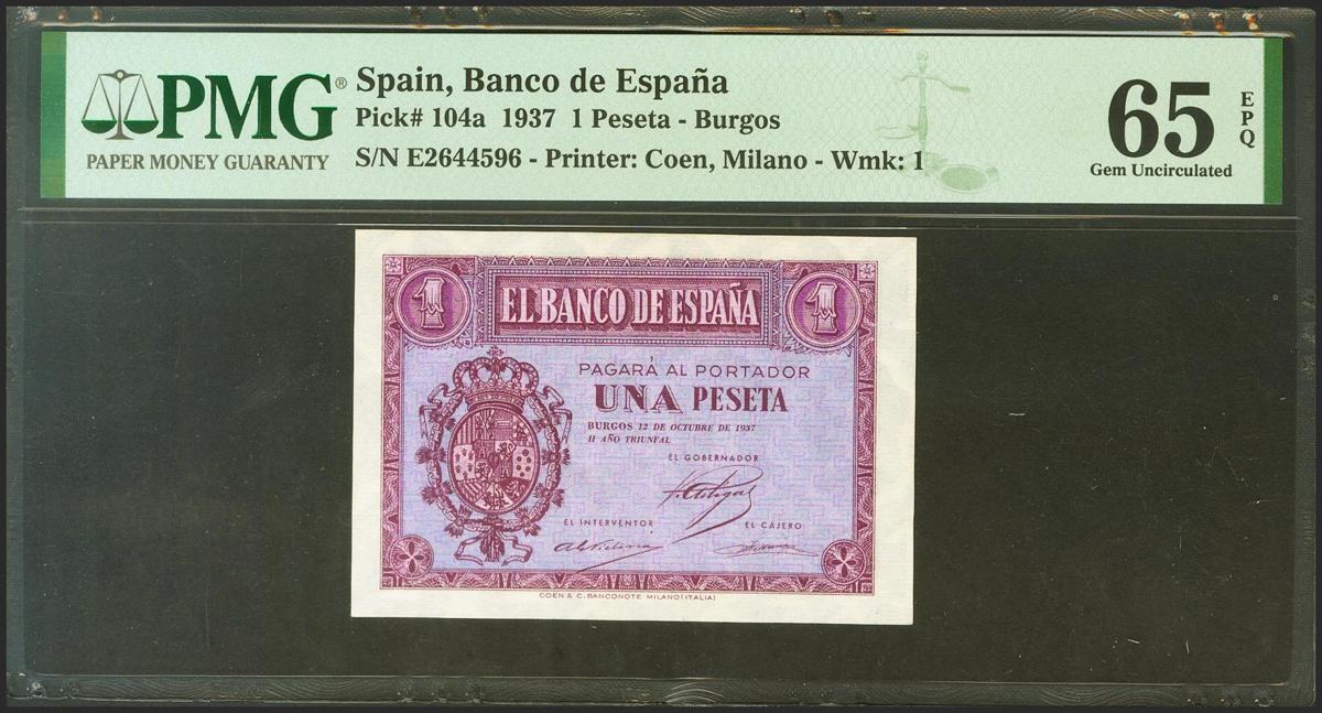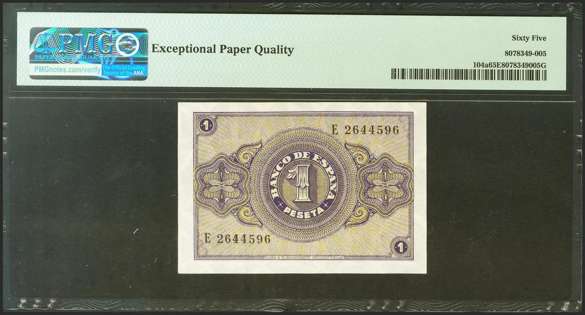 1 Peseta. October 12, 1936. Series E. (Edifil 2021: 425a, Pick: 104a). Original sizing. PMG65EPQ package.