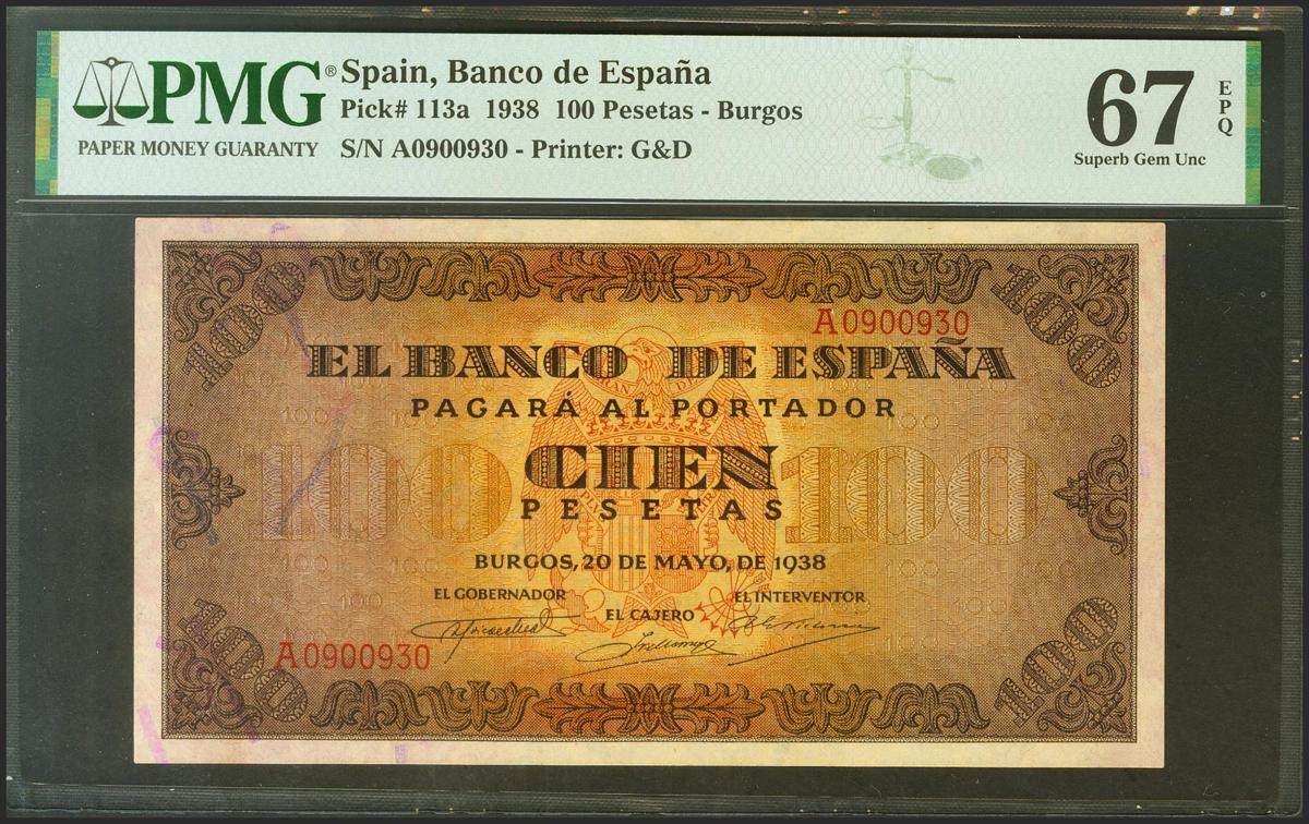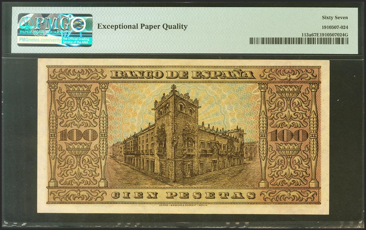100 pesetas. May 20, 1938. Series A. (Edifil 2021: 432). Extraordinarily rare in this quality, it retains all of its original sizing. Uncirculated. PMG67EPQ package.