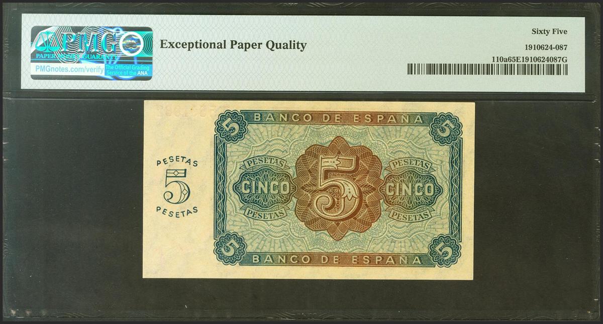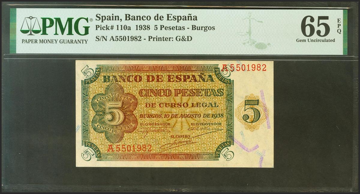 English 5 pesetas. August 10, 1938. Series A. (Edifil 2021: 435, Pick: 110a). Unusual in this quality, original sizing. Uncirculated. PMG65EPQ package.
