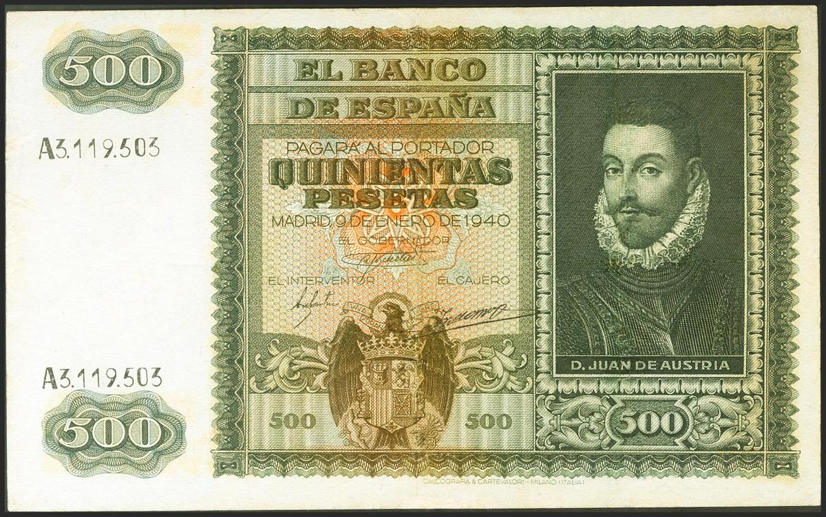 500 pesetas. January 9, 1940. Series A. (Edifil 2021: 439). Good Very Fine.