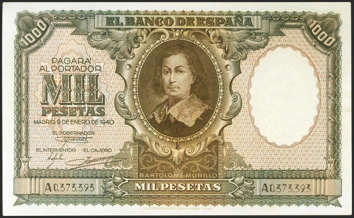 1000 Pesetas. January 9, 1940. Series A. (Edifil 2021: 440). It retains part of its original sizing, a highly spectacular bill. Extremely Fine.