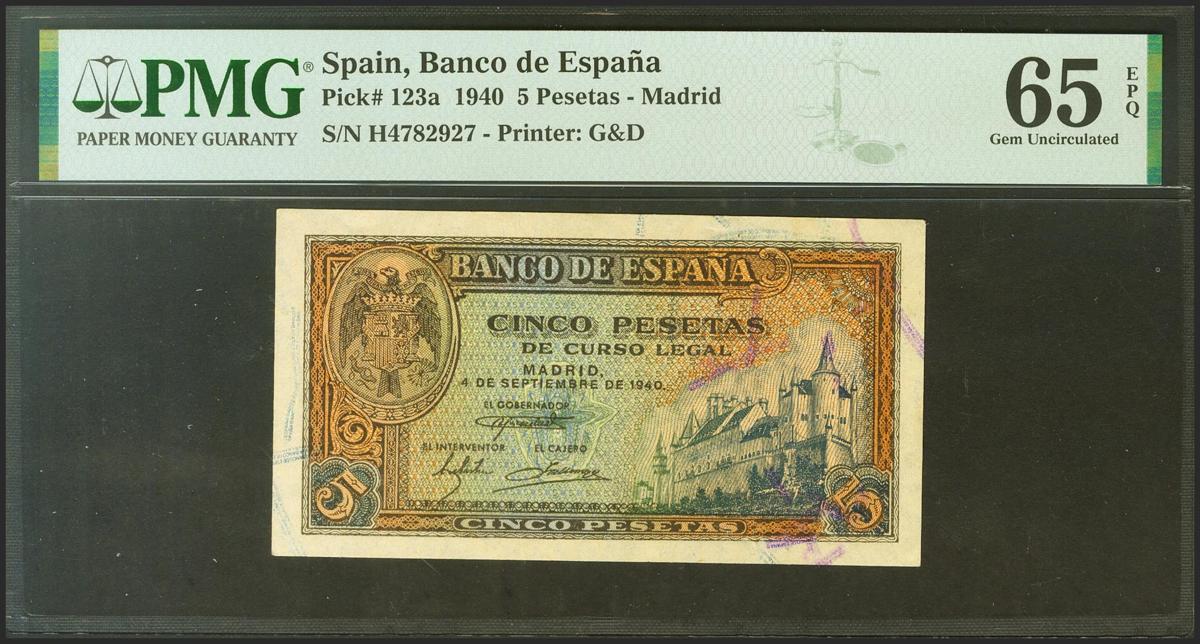 5 pesetas. September 4, 1940. Series H. (Edifil 2021: 443a). Unusual in this conservation with all its original sizing. Uncirculated. PMG65EPQ package.